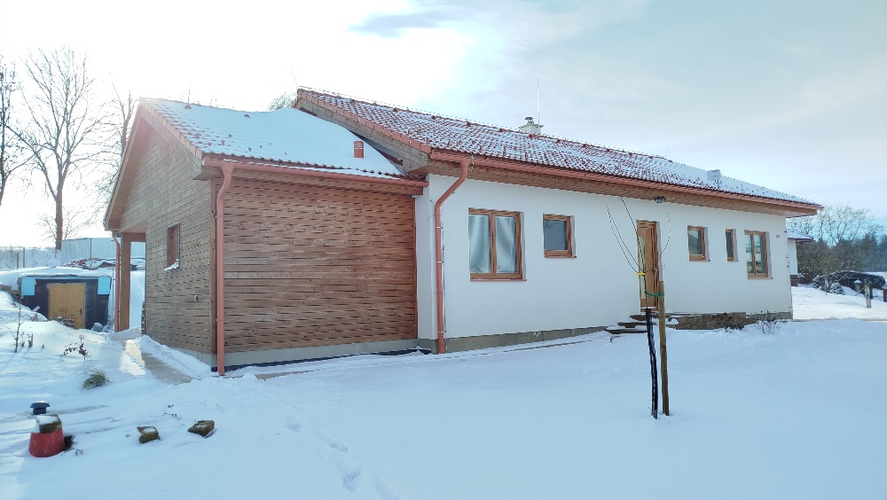Bungalov vytápěný pomocí tepelného čerpadla s rekuperací, mastkovými kamny a venkovními žaluziemi.